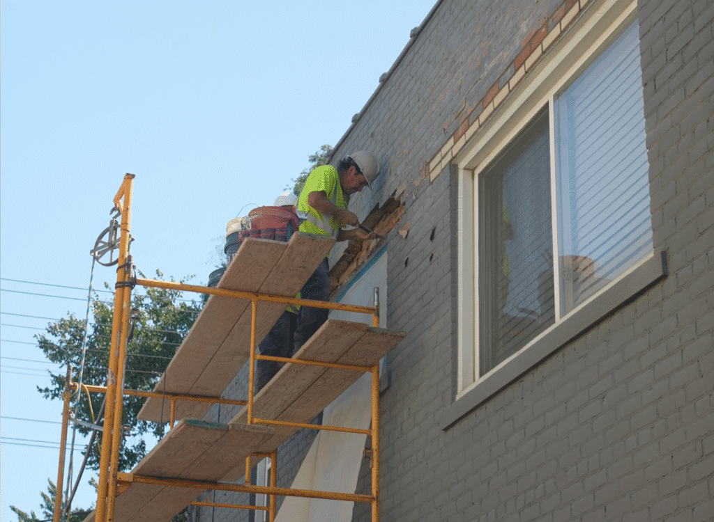 Facade repairs can address cracks, loose masonry, water intrusion, joint failure, and material deterioration.